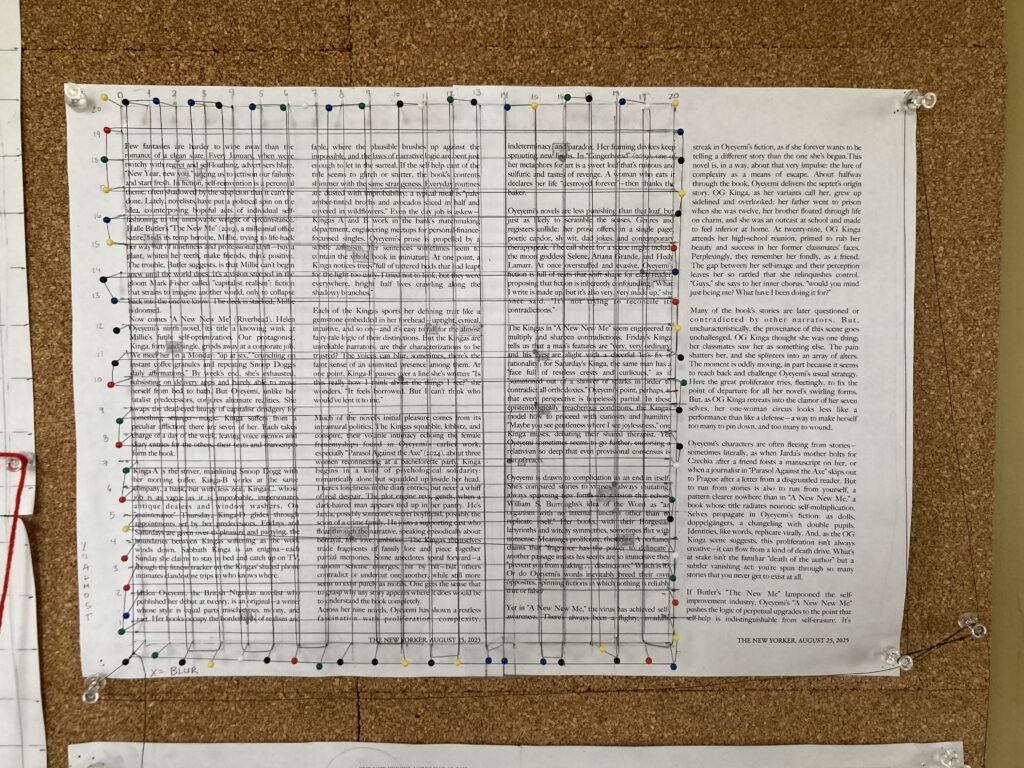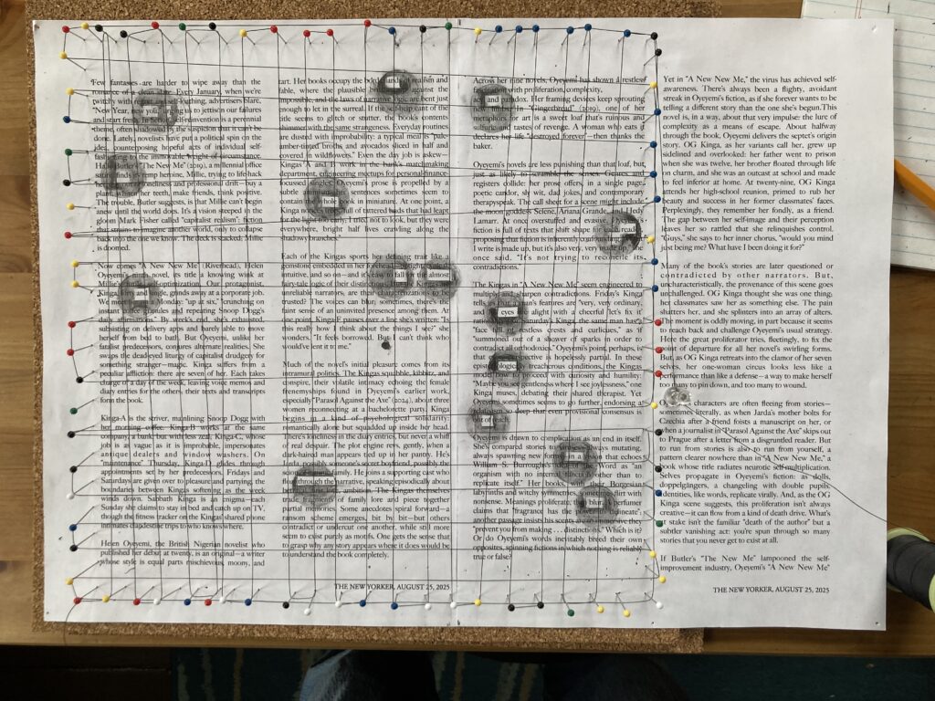 a 10×10 grid made of black thread and pins, placed over a NYer book review of Helen Oyeyemi’s new booka closer look at the grid and the first word of the poem, fall