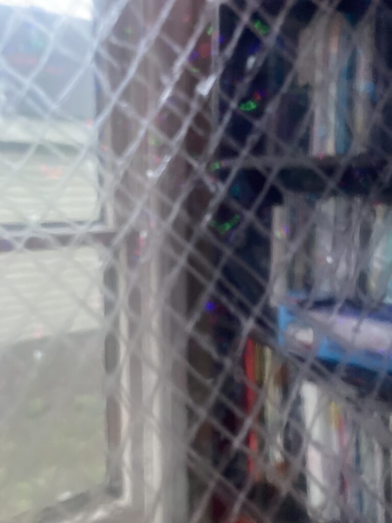I asked Scott and he thought that working with black netting might be too difficult and that the look of it also had been done before. He’s a fan of the ziploc bag look. I like that look, but I don’t think it translates from a distance, and the “big picture” is part of what I’m trying to achieve. Also, as I told RJP, part of why I am doing these poems is to show what my vision is like as I read (and, if I’m being honest, to “prove” that it’s real and substantial). I’m still liking the netting most. Is there another material that could achieve a similar effect but was easier to work with? What about window screens? I like window screens because they are already framed. Could I find some used ones at ReStore? Does the screen offer enough of a distortion?