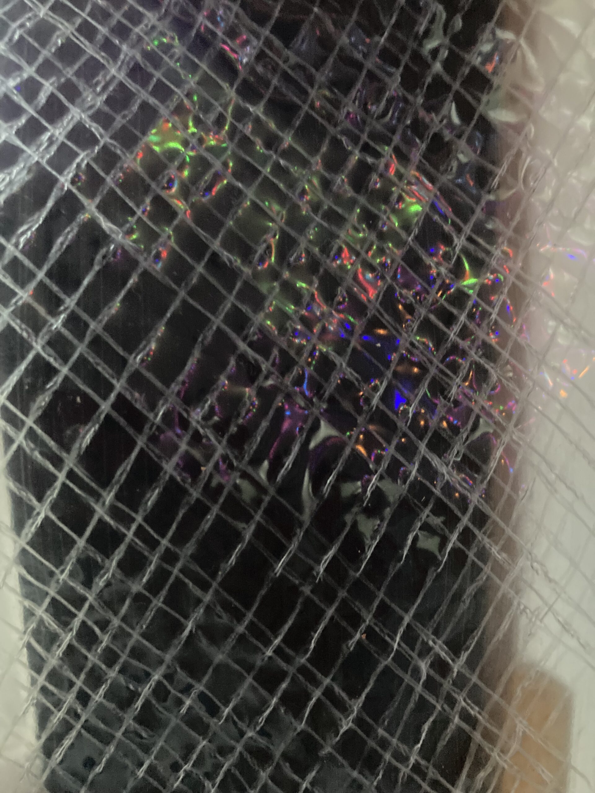 I like the netting and the feeling of black. However, this netting was hard to cut! So hard that I couldn’t manage to cut the inner hole to expose the word/s of the poem. I should ask RJP for advice, or have her cut it. Examining the effect closer, I like it. Now I need to find out how to cut a hole into for the poem word! And, how should I attach this netting?