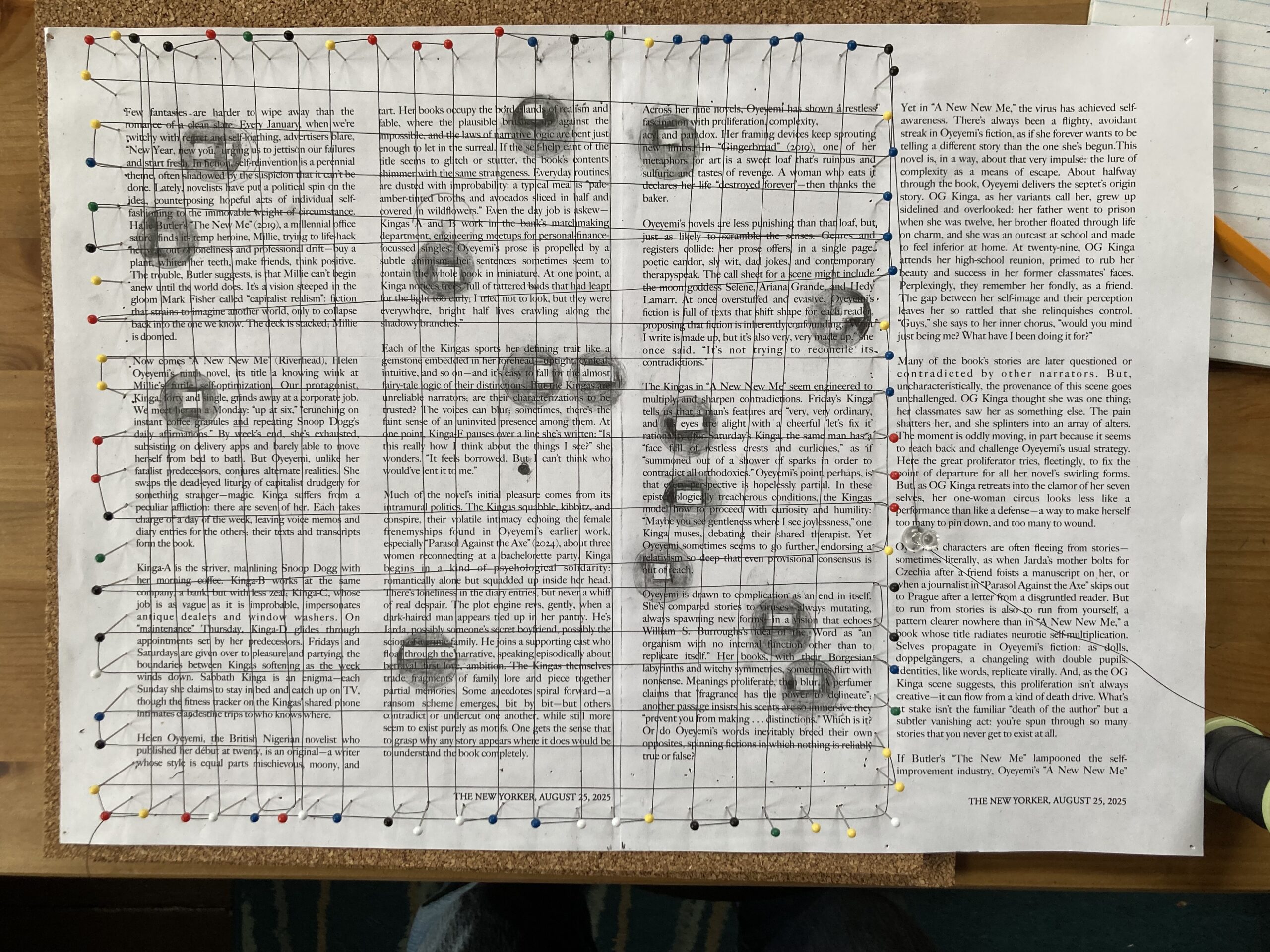 So many directions I could go with these ideas. I love this idea of thinking about the grid and the material/meaning of its lines. In a New Yorker article that I’ve already used for at least 2 (maybe 3) sections of Holes 5, the phrase, pull the strings, appears. I noticed last week and put it aside. Now I’m thinking of shifting my poems from Holes to Threads (or strings or lines). Whereas the rule with Holes poems is that “hole” had to be in the text, I’m thinking of being more flexible with this new direction: maybe, for each new essay/article that I use, I find a different name/word for connecting lines. I already have strings (from “Mystery Man”) to work with. And, I found another article, about Arundhati Roy’s new memoir that has “hole” AND “thread.”