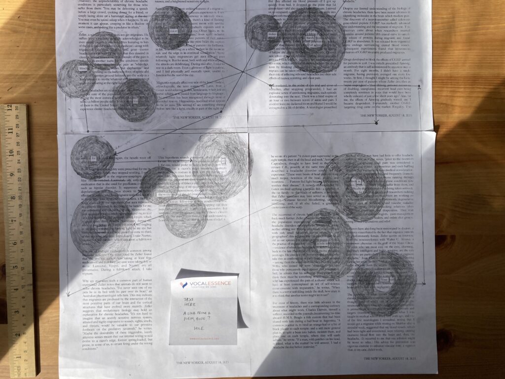 First, an update on Holes. There’s an empty space without text in the lower left corner. I’m thinking of putting a definition or a quote or a line there. Or, I could put my poem written out in a straightforward way in the space. Would that undercut of enhance the experience of reading the poem? The text could also be an explanation of my version of reading; peripheral — big picture / central — one word or small phrase at a time, often experienced in isolation.