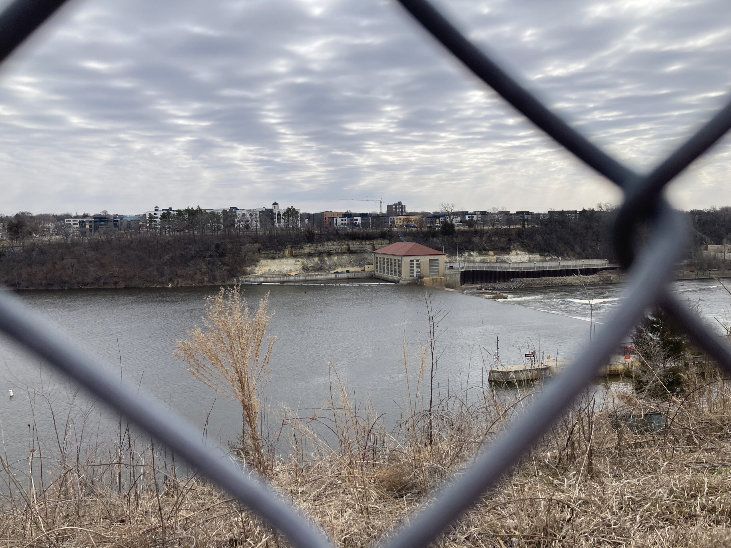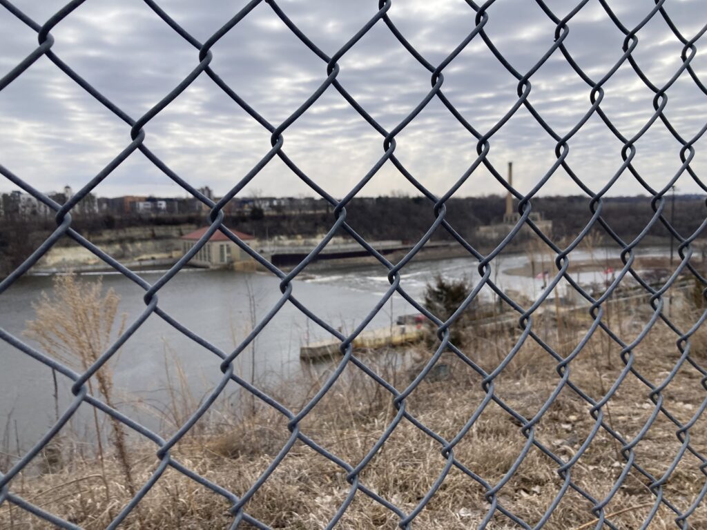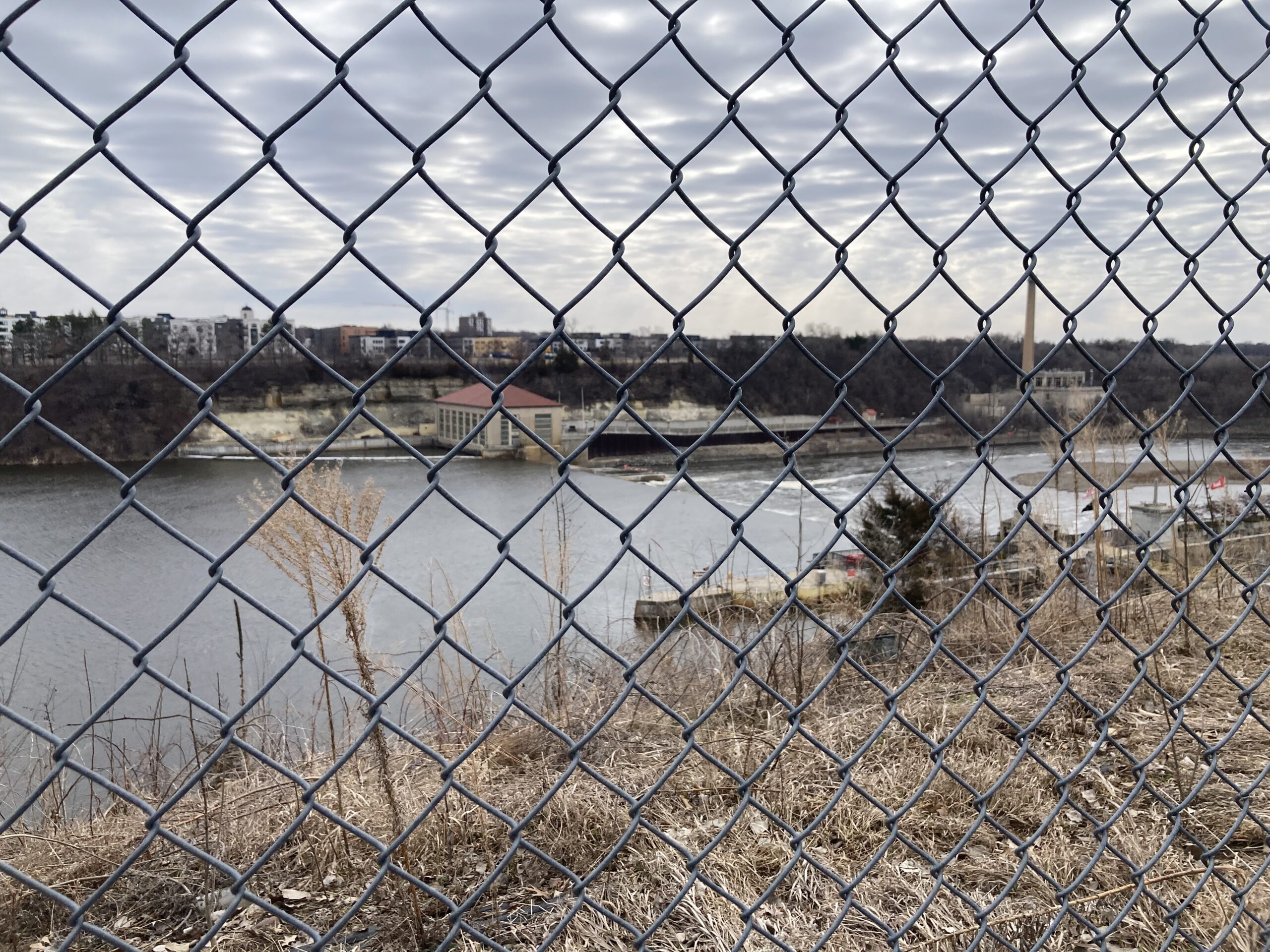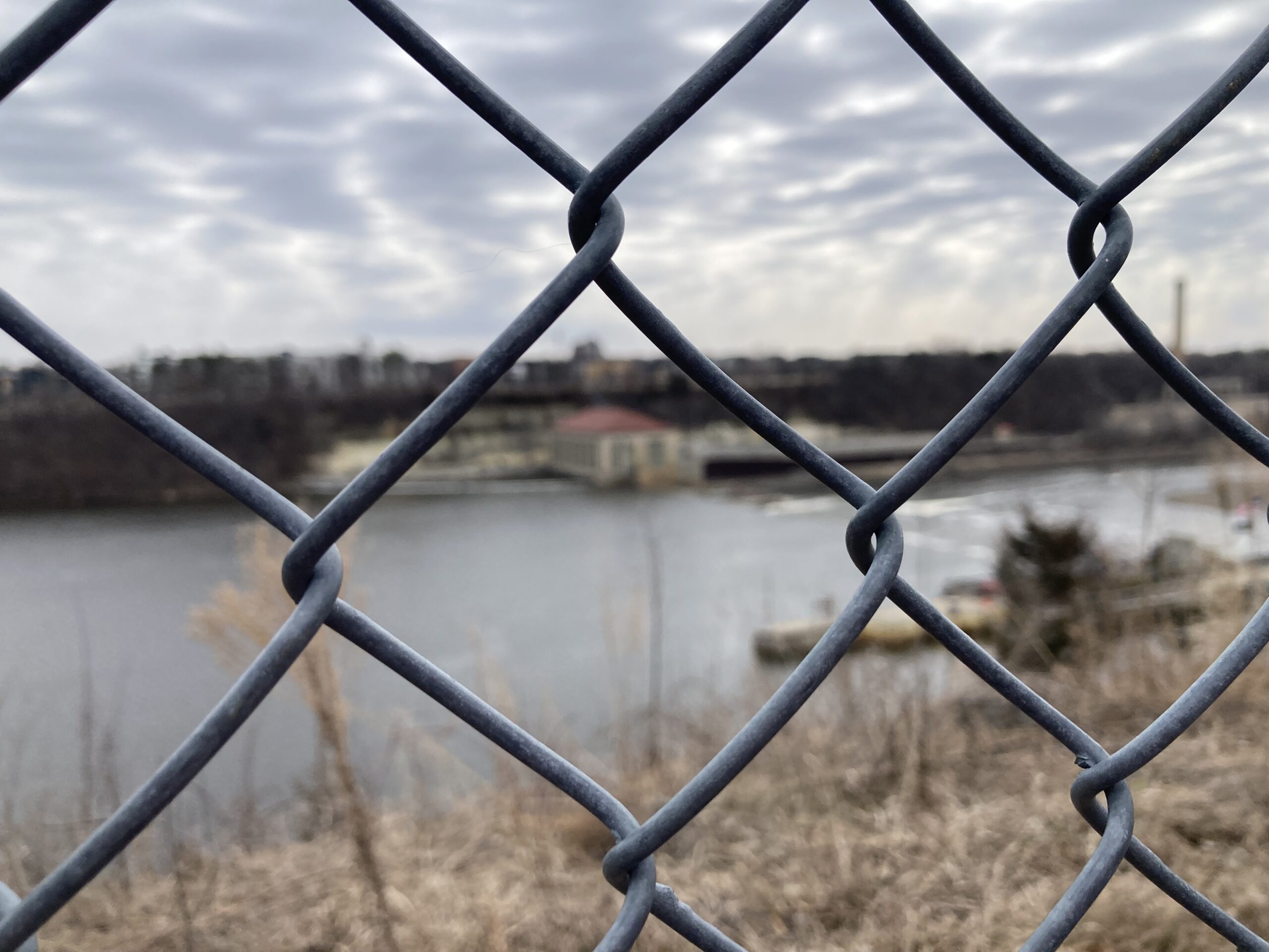 - at the top of the wabun hill, stopping to look through the chain link fence at the river