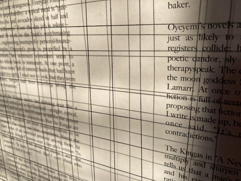 I do like the elevated grid and the way you have to look through and around it to find the right word. I also like the thin thread that you almost can’t see. That’s how my vision often works: it’s not a solid wall of black, but the faint trace of something, sometimes feeling like a net or a screen that makes it harder to focus on anything. One more thing: when I ‘m reading, it does feel like each word or phrase is encase in a grid, with nothing outside of the grid in focus.