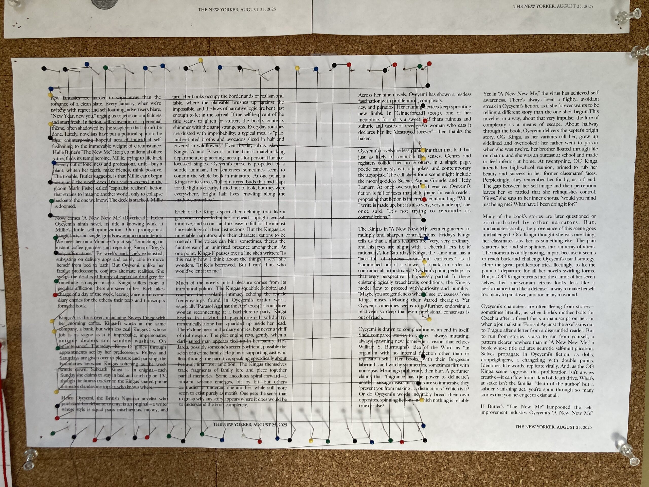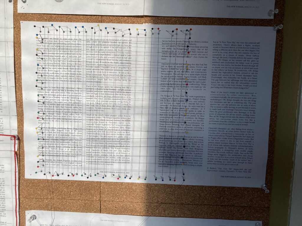 I really like this grid overlay, even as I recognize that I need to do more to it to make it make sense to a reader/viewer. The pins are difficult to work with on the thin cork board. They twist and bend out of place. What will I use for a different/the final version of this poem? I showed it to Scott and he suggested a frosted plexiglass layer with only the words of the poem visible. At least, I think that’s how he described it; I’m not quite understanding what he means. I’m wondering if encasing the words in a small dot (both a reference to the center dot of an Amsler grid AND xy coordinates on a graph) might work. One problem: I don’t want to remove the pins and draw the dot in, then have to re-string/pin the grid. I need a better solution for that!