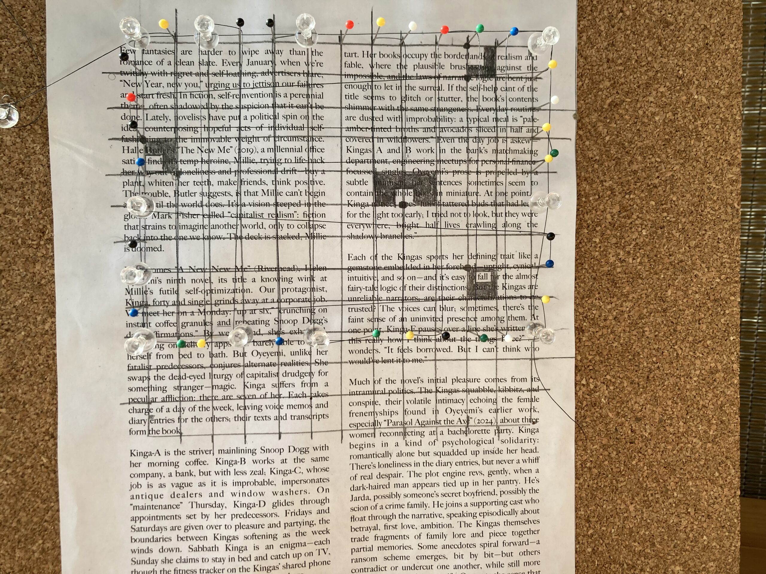 First, I’d like to return to my original version of Holes 1, with my blind spot around each of the words. I want to experiment with different ways to “make” that blind spot — color it in with dark pencil; erase that pencil, leaving only a trace; a plastic bag; a net of thread; sparkles or something that resembles static — how do you realize that?; the black netting I bought with RJP. Instead of Holes 1, I’m using Holes 5c about the two holes.