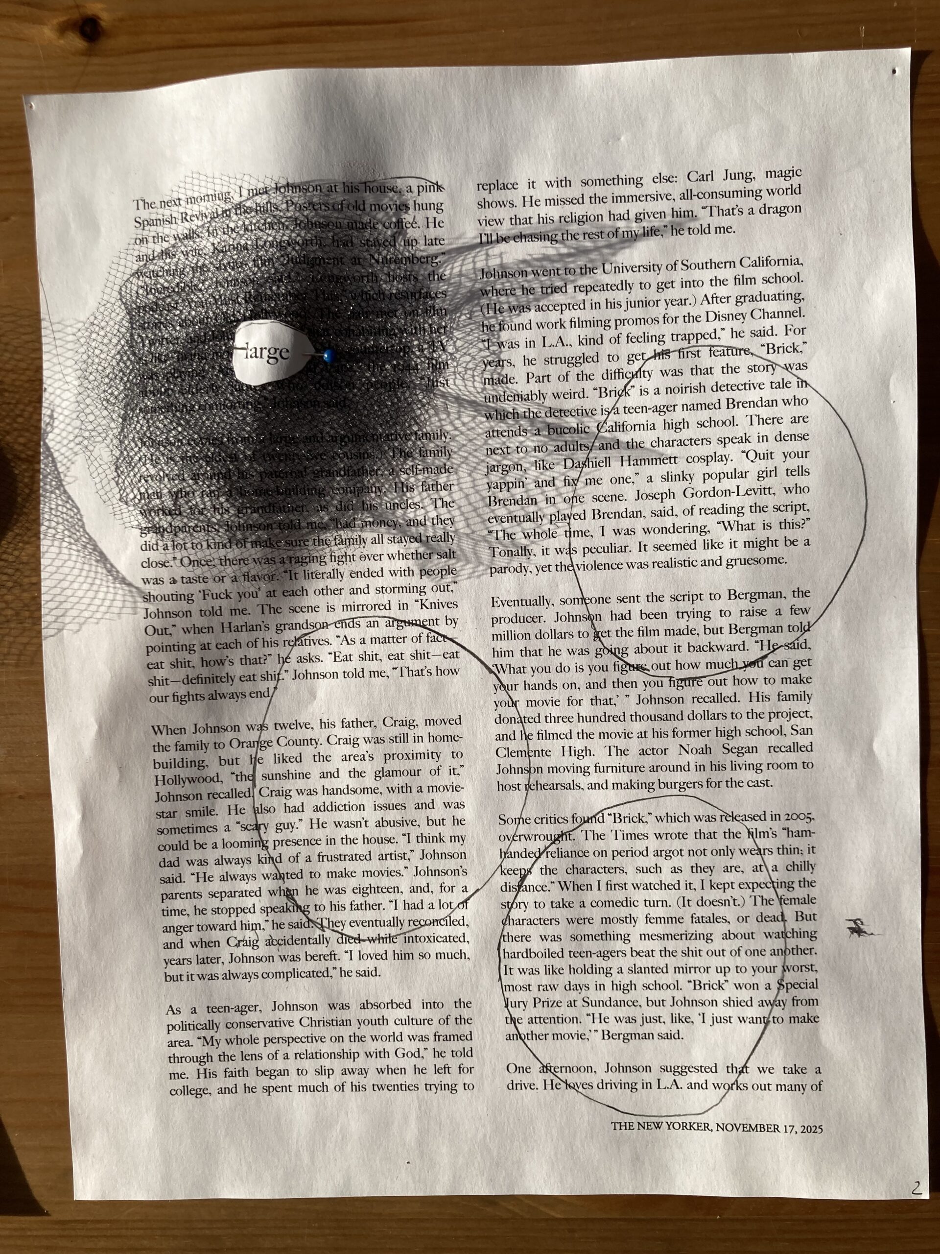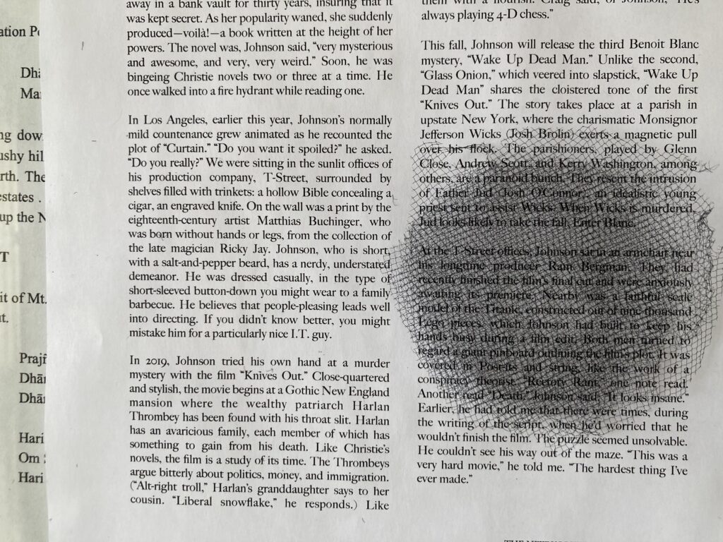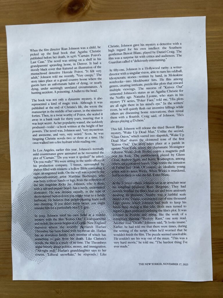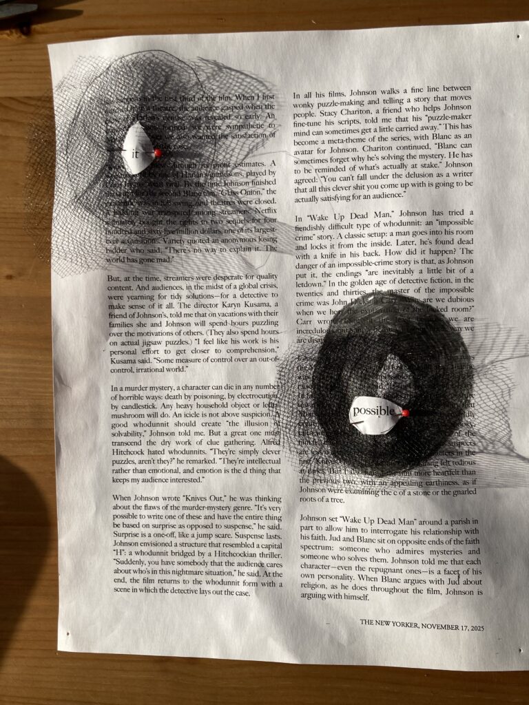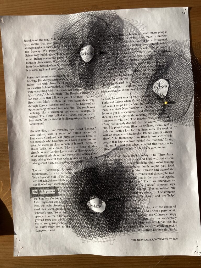 I like the netting and the feeling of black. However, this netting was hard to cut! So hard that I couldn’t manage to cut the inner hole to expose the word/s of the poem. I should ask RJP for advice, or have her cut it. Examining the effect closer, I like it. Now I need to find out how to cut a hole into for the poem word! And, how should I attach this netting?