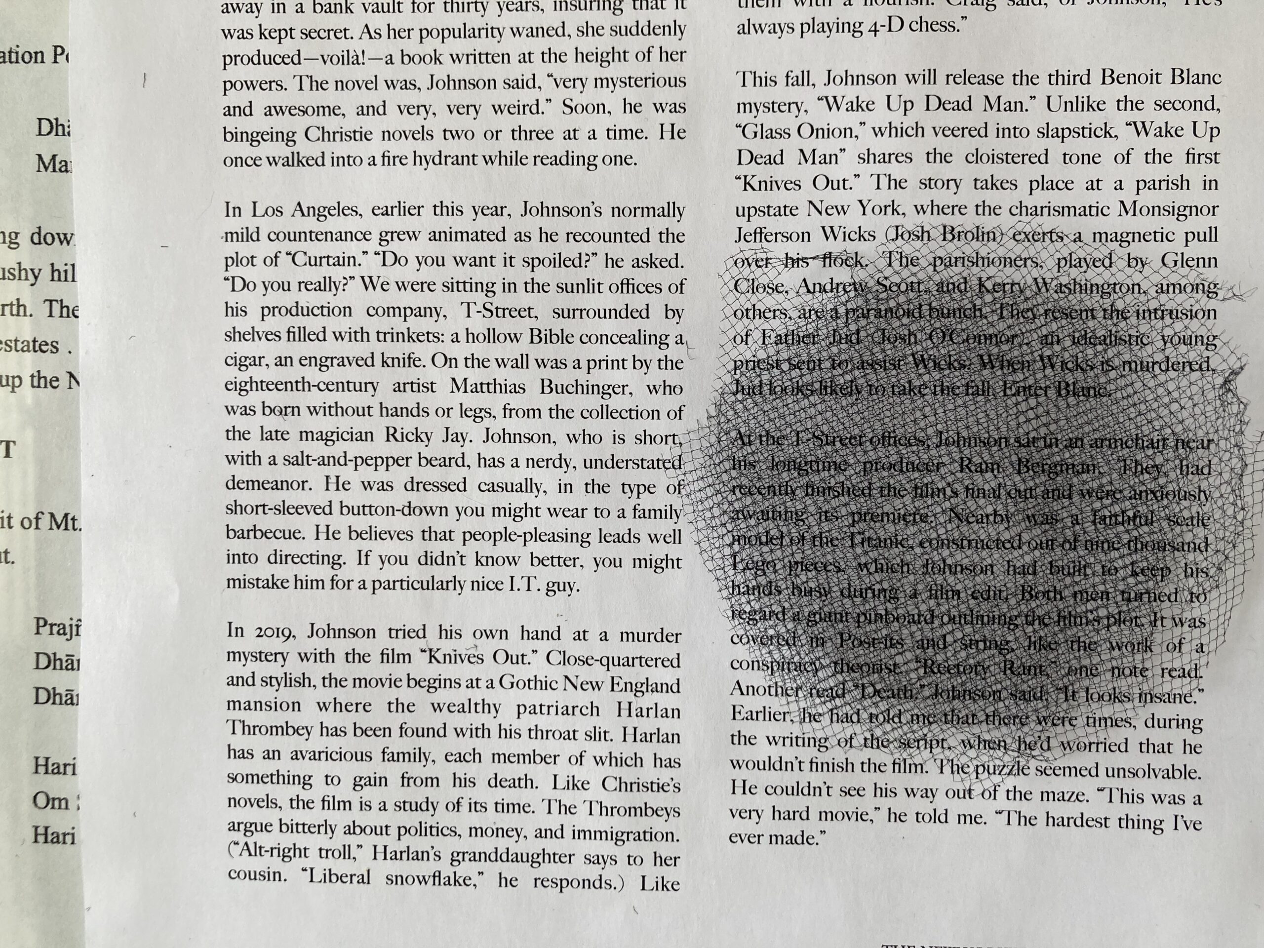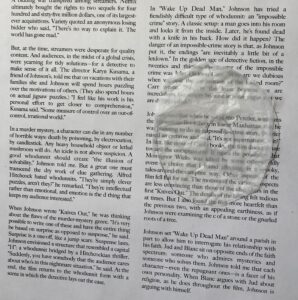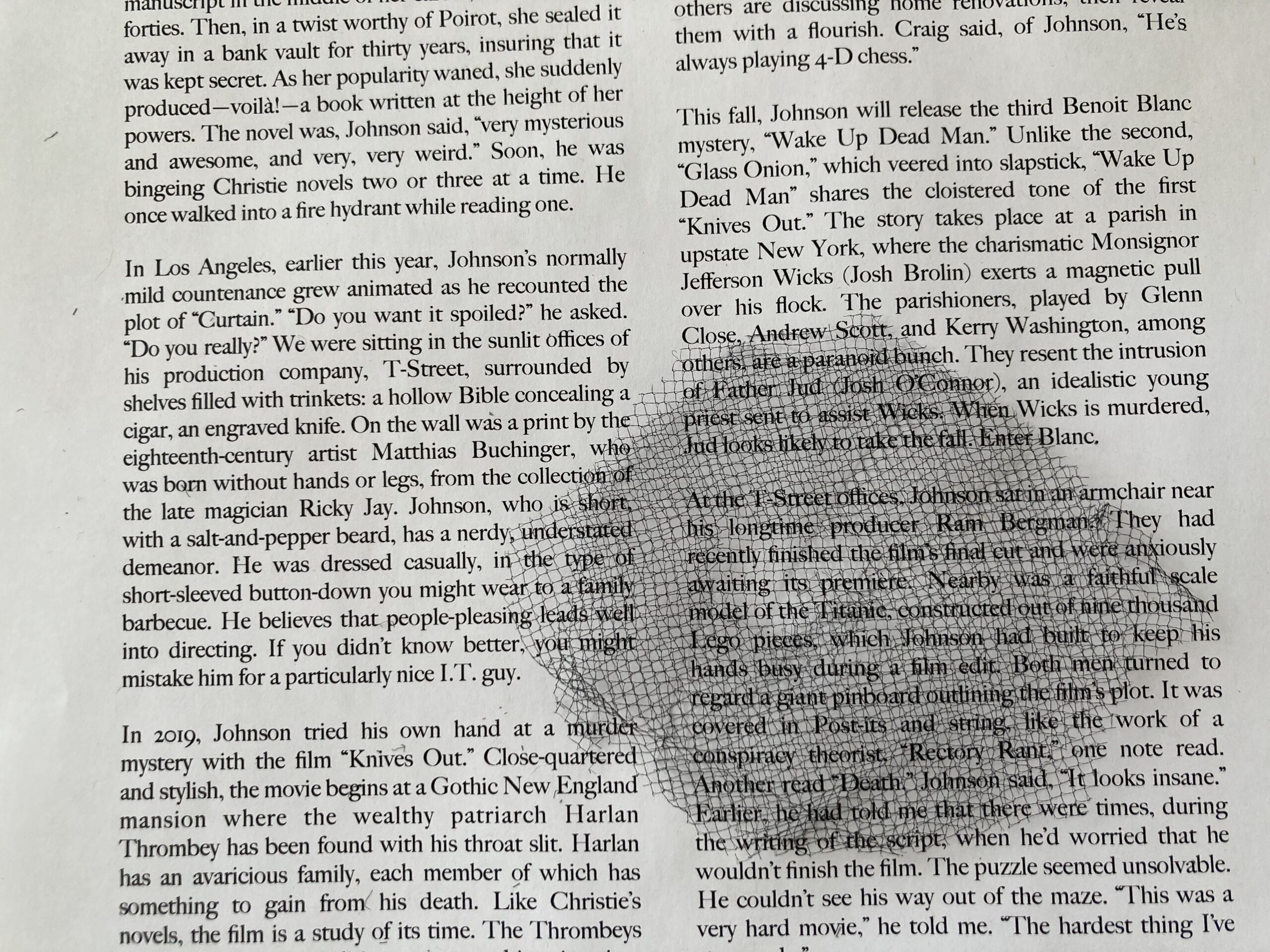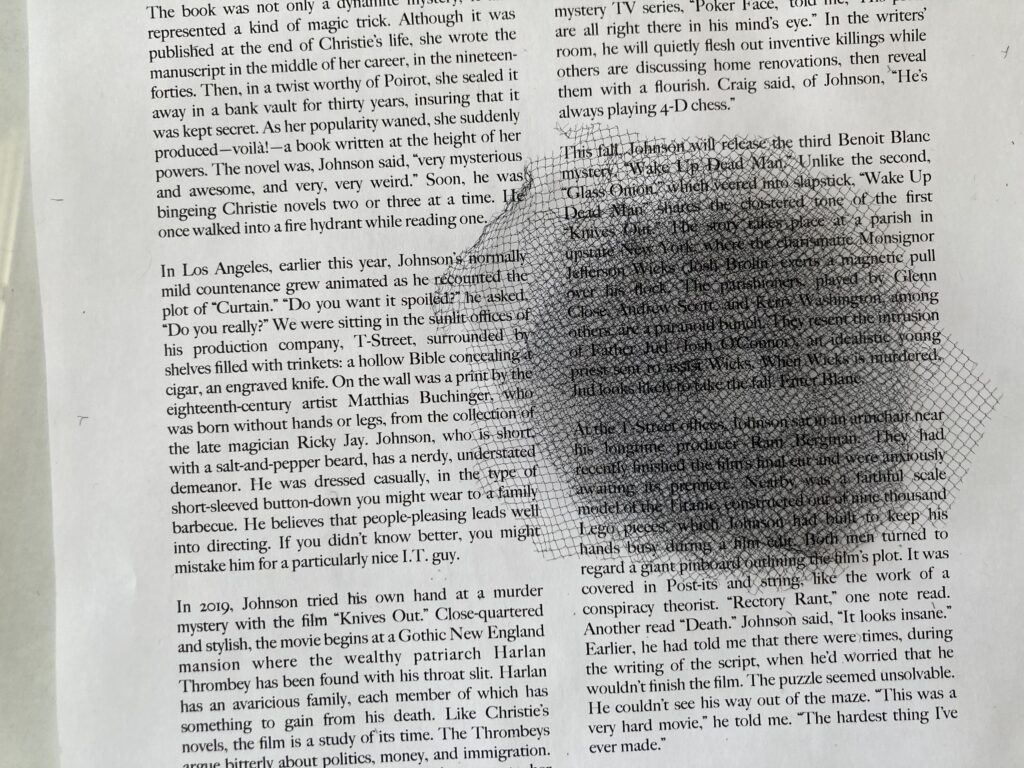 I asked Scott and he thought that working with black netting might be too difficult and that the look of it also had been done before. He’s a fan of the ziploc bag look. I like that look, but I don’t think it translates from a distance, and the “big picture” is part of what I’m trying to achieve. Also, as I told RJP, part of why I am doing these poems is to show what my vision is like as I read (and, if I’m being honest, to “prove” that it’s real and substantial). I’m still liking the netting most. Is there another material that could achieve a similar effect but was easier to work with? What about window screens? I like window screens because they are already framed. Could I find some used ones at ReStore? Does the screen offer enough of a distortion?