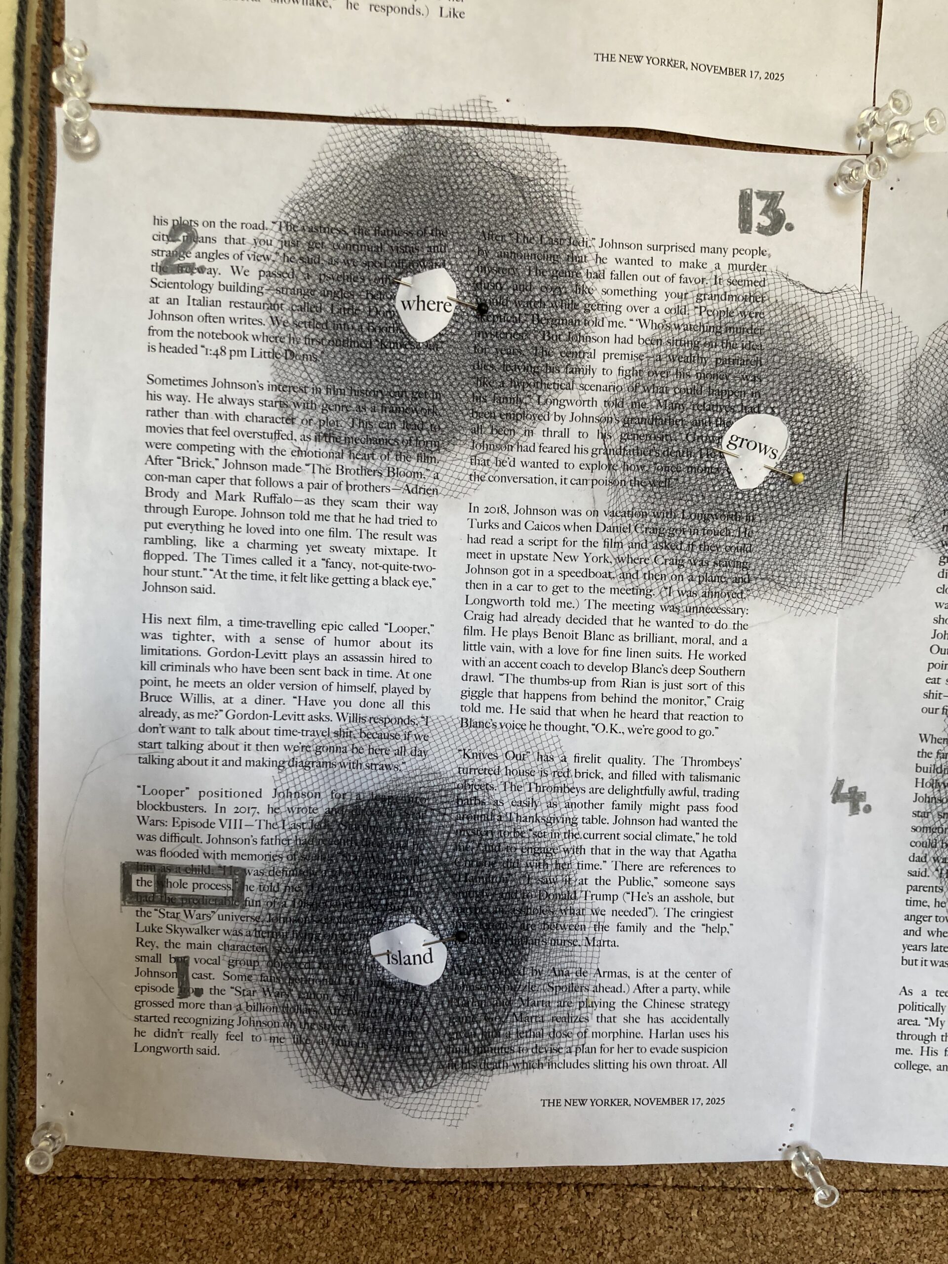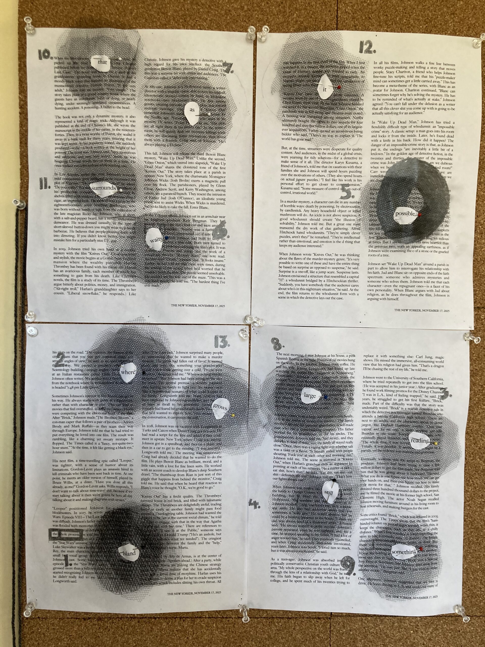 Today, more cutting out black netting holes and layering and mapping them on the paper. For now, I’m pinning them, but I’m wondering if I could fasten them with a button through the center and then glue the word to the button? Would that work on paper? Only one way to find out — I just need more buttons and a needle!