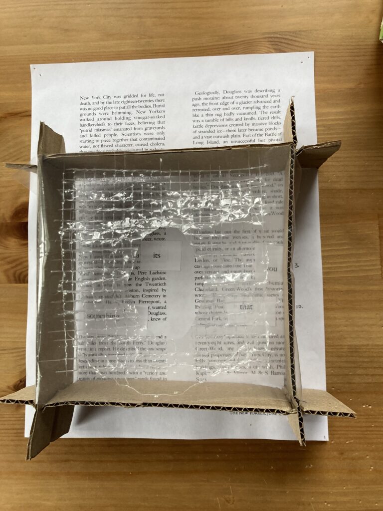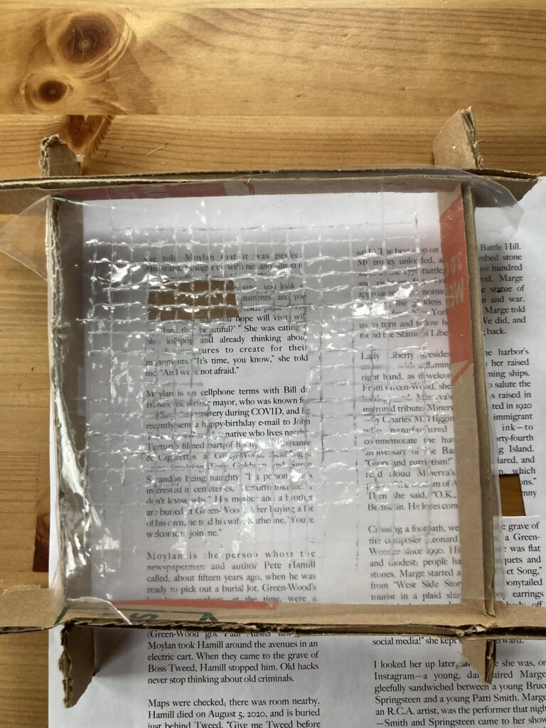 At some point, another thought: create a frame out of strips of cardboard. First I tried strips that were 2 inches thick. I slotted the strips to make the frame, then put the distressed plastic with the amsler grid/blind spot over it. I placed this frame over one panel of Holes 4. I liked it, but it was messy. And difficult to read. I wondered, would making a thinner frame help? I made one with 1 inch strips and added a different distressed Amsler grid. Still messy, still not quite right.